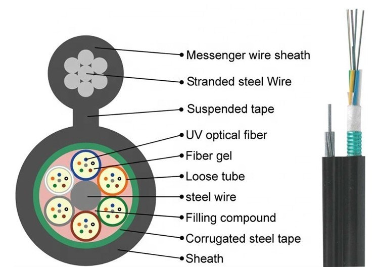 De vezels worden geplaatst in de losse buis die van een modulusplastiek wordt gemaakt. De buizen worden gevuld met een waterbestendige het vullen samenstelling. Een staaldraad bepaalt van in het centrum van kern de plaats als metellic sterktelid. De buizen zijn vastgelopen rond het sterktelid in een compacte en cirkelkabelkern. Na een Plastic met een laag bedekte staalstrook en een schede, dit die deel van kabel met de strengen wordt begeleid aangezien de bijrol met een polyethyleenschede om figuur 8 te zijn structuur wordt voltooid.